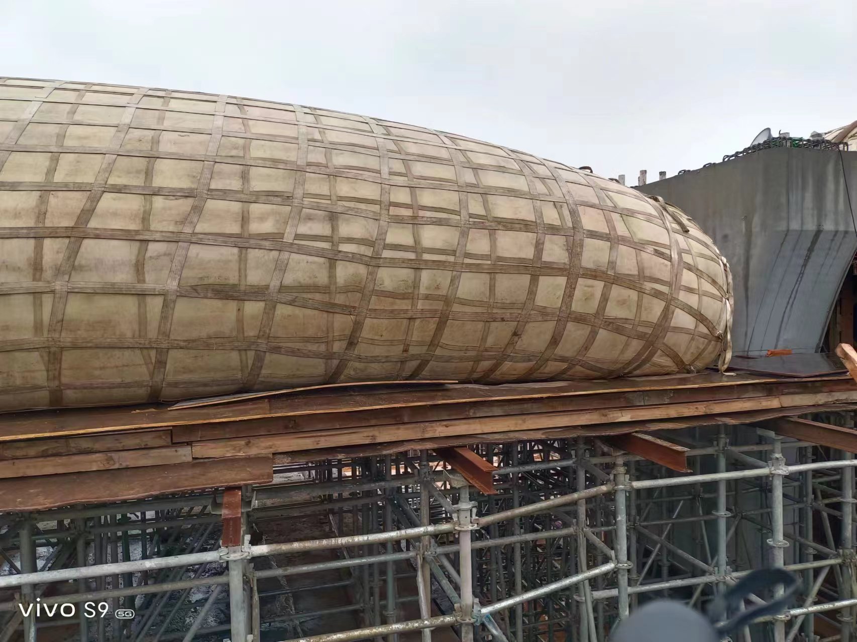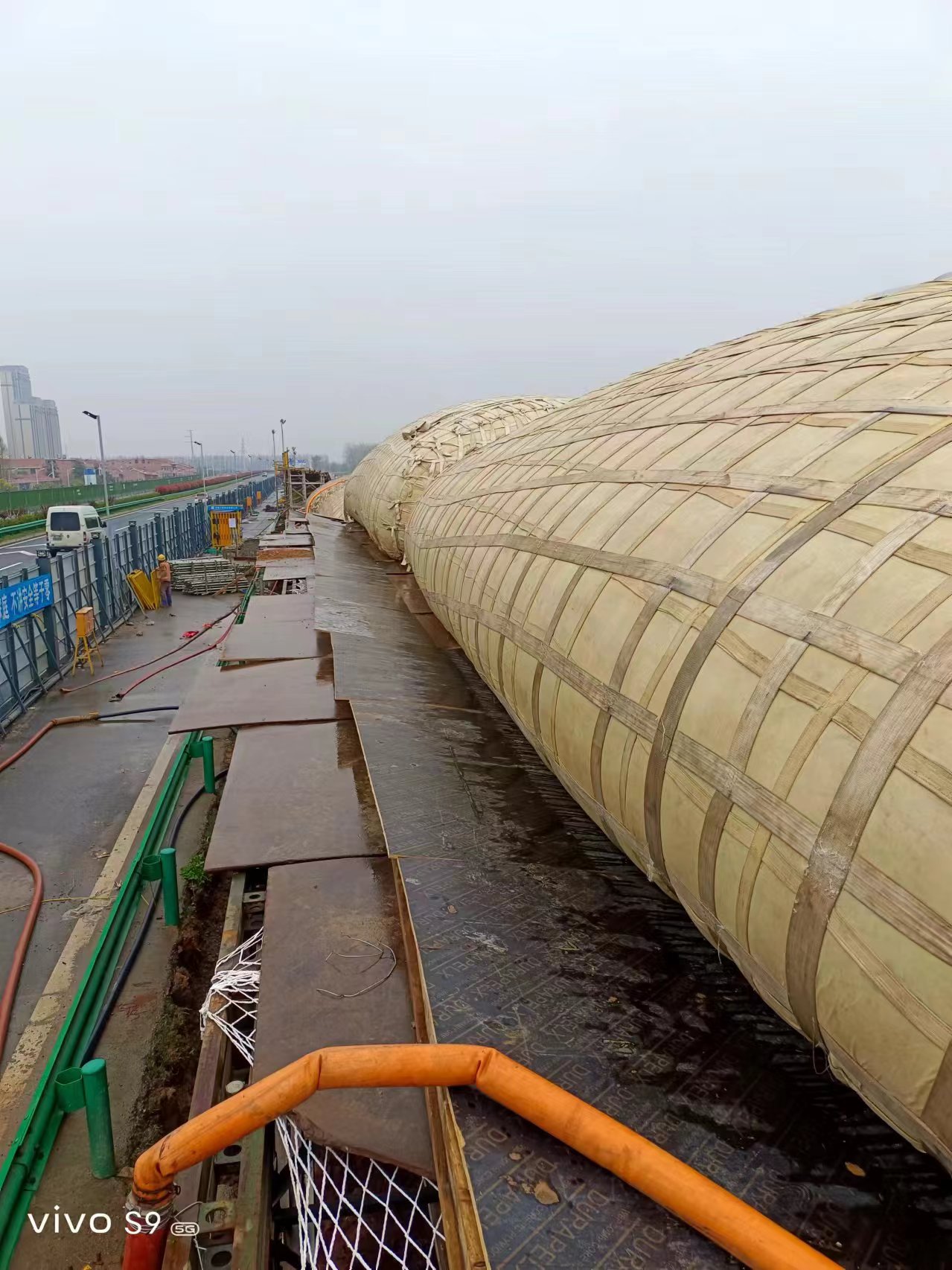 現(xiàn)場(chǎng)可以看到,施工現(xiàn)場(chǎng)已經(jīng)打圍,工人們?cè)陉幱晏鞖獾那闆r下,進(jìn)行支架搭建、模板鋪設(shè)等工作,為即將進(jìn)行的水袋預(yù)壓做準(zhǔn)備。